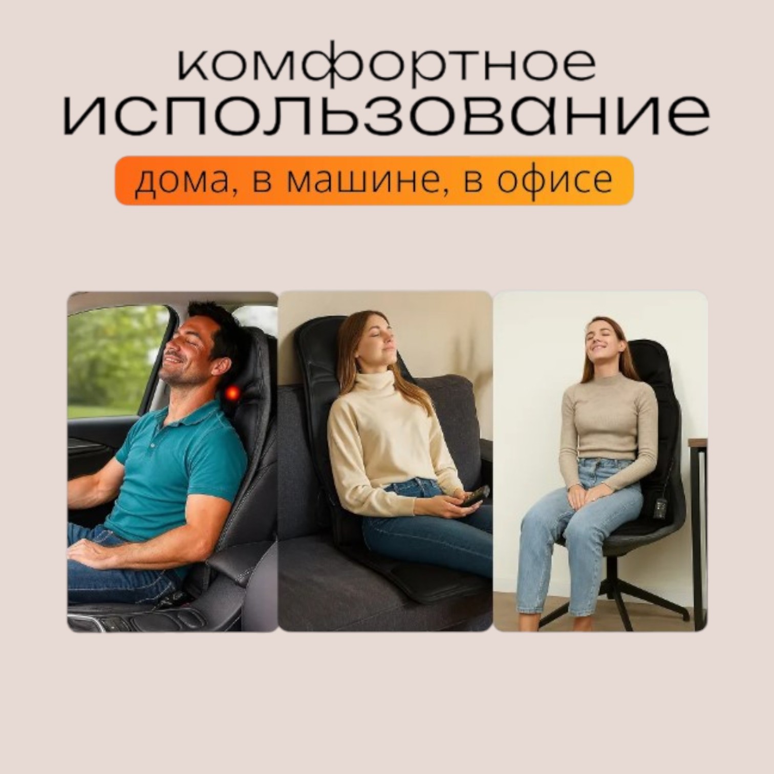 Массажная накидка на кресло — это идеальное решение для тех, кто ценит комфорт и заботится о своём здоровье. Она обеспечивает эффективный массаж шеи, спины, поясницы, плеч и ягодиц, помогая снять напряжение после долгого рабочего дня или физической нагрузки. Устройство подходит как для домашнего использования, так и для офиса — особенно полезно тем, кто много времени проводит в сидячем положении.